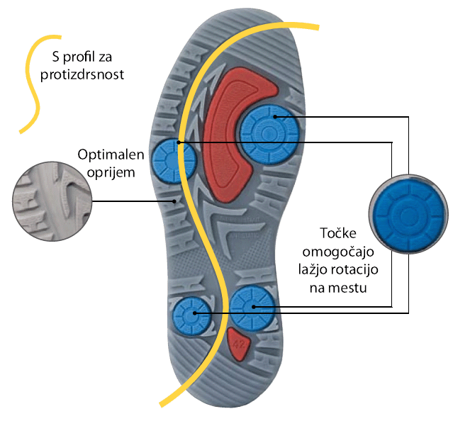 Ergo-Active TPU/PU podplat se optimalno prilagaja ergonomskim točkam na zunanji strani nožne kosti v predelu pete in s tem zmanjšuje trenja na minimum, kar preprečuje utrujenost pri delu. Poleg tega je Ergo Active podplat protizdrsen.