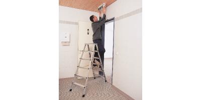 Dvokraka, obojestransko pohodna alu lestev. Delovna višina: 2,40 m; število stopnic: 2 x 3.Več