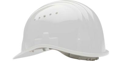 Bela zaščitna gradbena čelada s podaljšanim zatilnim delom, 16mm režo in žlebom za odtekanje ...Več